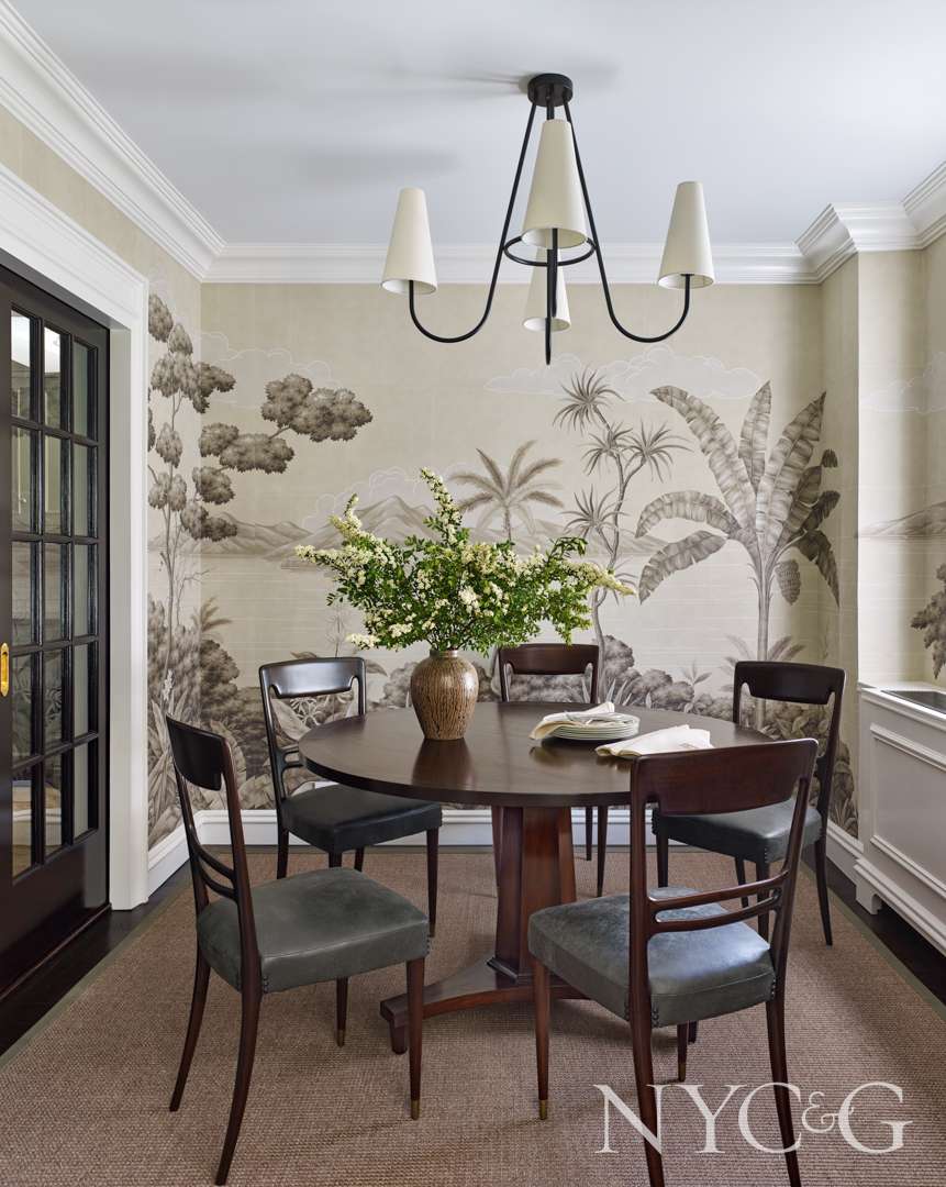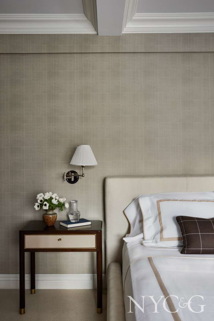 While the couple entertains guests both in the dining area, which is marked by a floral mural, and in the living room, they retreat to the den when wishing to watch TV together or work at the desk. “The intention for the den was for it to be really cozy,” explains Reid, “with a sofa upholstered in a very rich mohair.” In fact, the entire room is enveloped in wool, with a soft gray flannel covering the walls. As for the primary bedroom, Reid carefully explains, “The bedroom is not a room I’m going to make moody. I like bedrooms bright, light, and airy, and just relaxing. This is a room you want to be in forever.” With its tones of ivory, a washed-out windowpane wallpaper pattern, and custom Leontine bedding demarcated by champagne-colored borders, this is a room that wears its elements well.