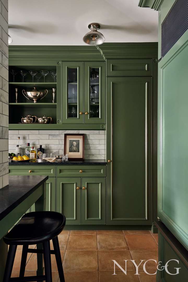 Reid kept the original kitchen cabinets but gave them new life with Benjamin Moore’s In the Garden, a deep mossy green he felt complemented the original terracotta floor tiles. He did, however, replace countertops and backsplashes, added new hardware and lighting. He chose one of his admittedly favorite materials, soapstone, for the counters—for the hue and for its leathered quality. “It feels nubby to the touch and the stone shows its age over time, just like our own faces.”
