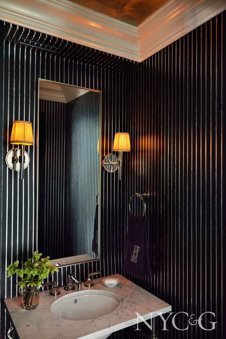 One of the plotlines Reid discerned quickly is that, while both men work in finance and dress well for their profession, one of them in particular is especially fashion savvy. “He’s a very snazzy dresser, who wears properly tailored suits, and, so, men’s suiting was one of the early inspirations for this apartment,” says Reid. He responded to that storyline by incorporating such details as precise piping to edge the sofas, a hand-painted pinstriped wallpaper in a powder room, a herringbone fabric for select chairs, and a haberdashery-like windowpane pattern in the primary suite. He also added decorative moldings and commissioned custom monograms for the bedding.