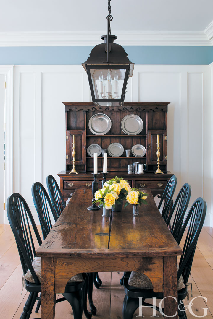 The farm table in the family room is 18th-century French. Antique pewter is displayed in an early-1800s hutch.