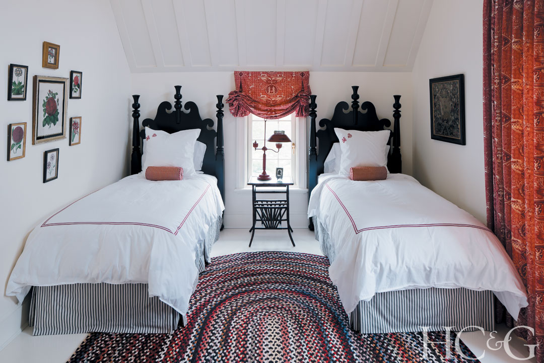 A collection of 18th-century floral needlepoints hangs in the twin-bedded guest room.