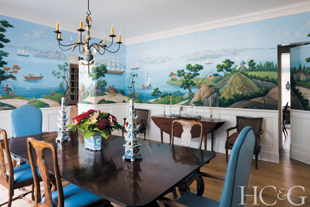 The hand-painted Stark mural depicts West Point on the Hudson RIver. Reproduction Queen Anne chairs surround the 18th-century English dining table.