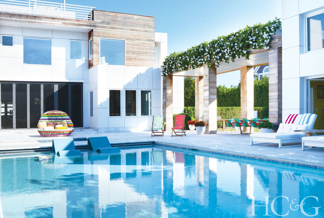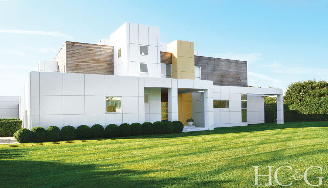 McDonough & Conroy Architects covered the lower façade of decorator Sasha Bikoff’s Bridgehampton home in aluminum composite panels and incorporated Brazilian wood siding on the upper level. The grounds are by Summerhill Landscapes.