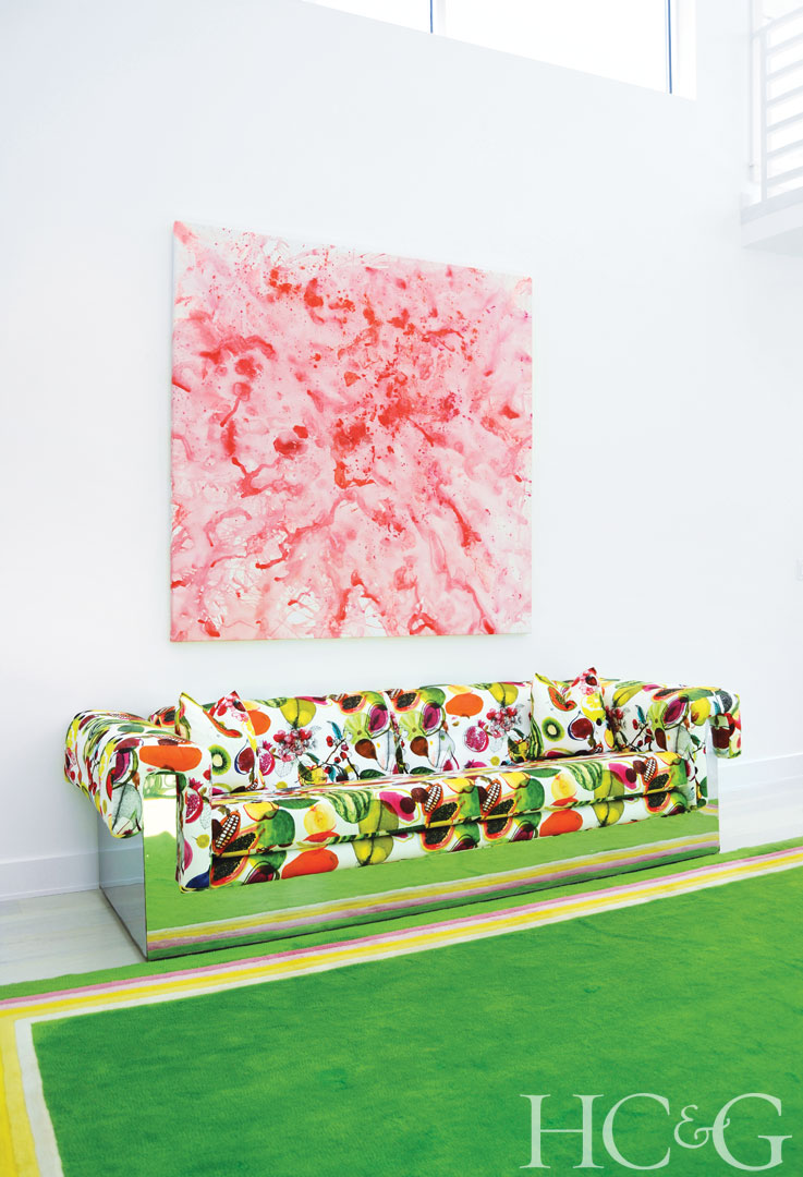 On the second-floor landing, Bikoff’s Menstruating Earth hangs above a Milo Baughman–designed sofa, which is covered in a Christian Lacroix fabric.
