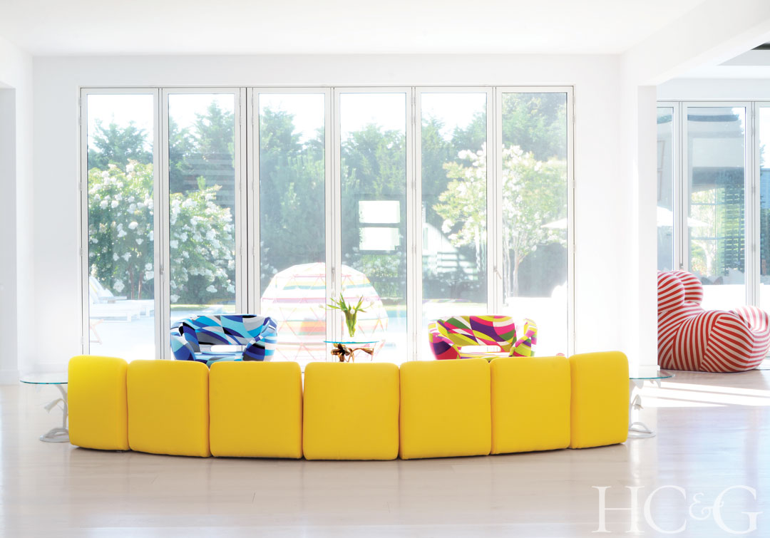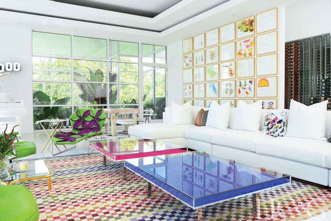 In the living room, Yves Klein’s Table Bleue and Table Rose sit atop a multicolored Missoni Home rug; the sectional is from Ralph Lauren Home.