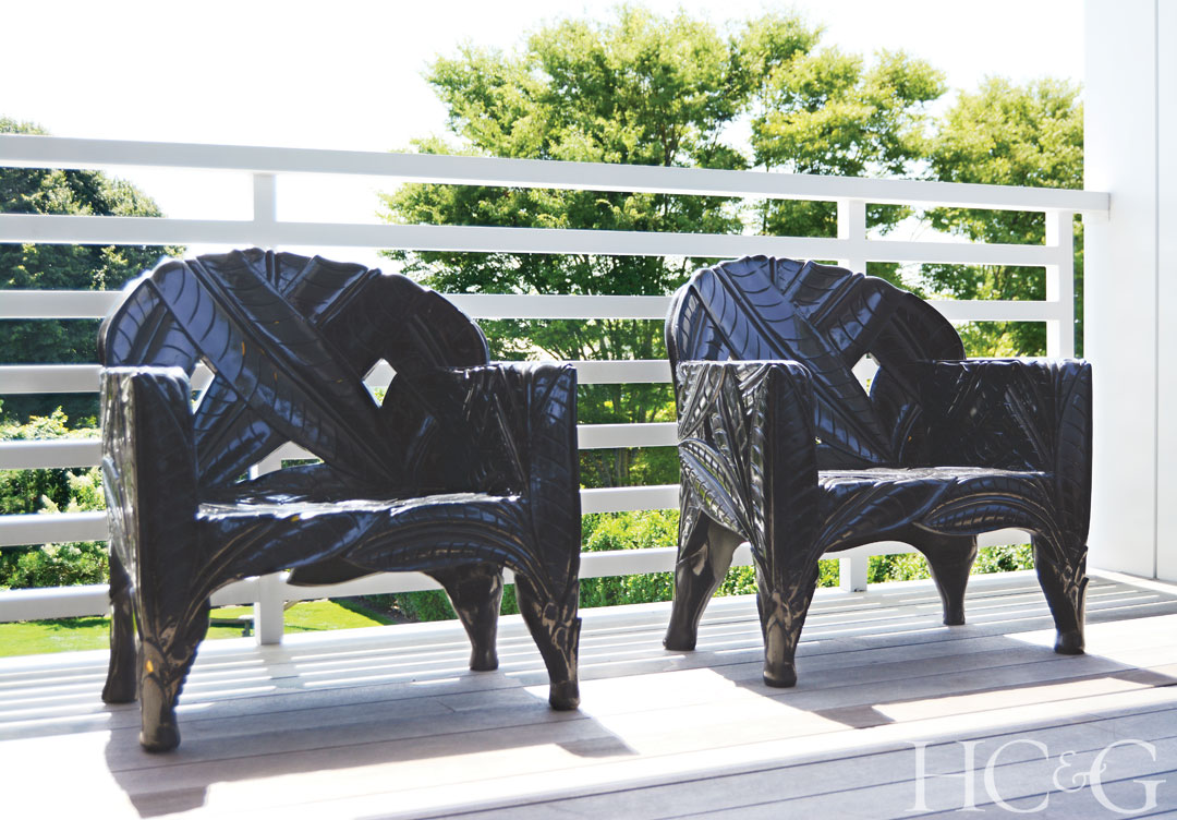 A pair of vintage lacquered-wood chairs sit on a terrace.