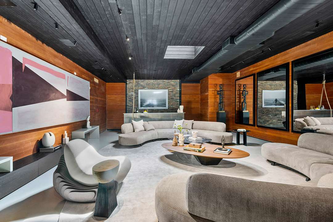 The five-level pad has been completely redesigned for luxury living, boasting bold and artful living spaces primed for entertaining. The foyer gives way to the open living room, which showcases brick and wood accents and 26-foot ceilings. A chef’s kitchen carries an industrial yet creative vibe, thanks to the unique, geometric cabinetry. Through the set of French doors sits a lovely terrace, which will be a welcome sight when summer comes around. On the upper two floors is where one will find three bedrooms and their ensuites. The spacious primary suite has a boho yet sleek bathroom, made of rainbow tiles in a floral pattern.