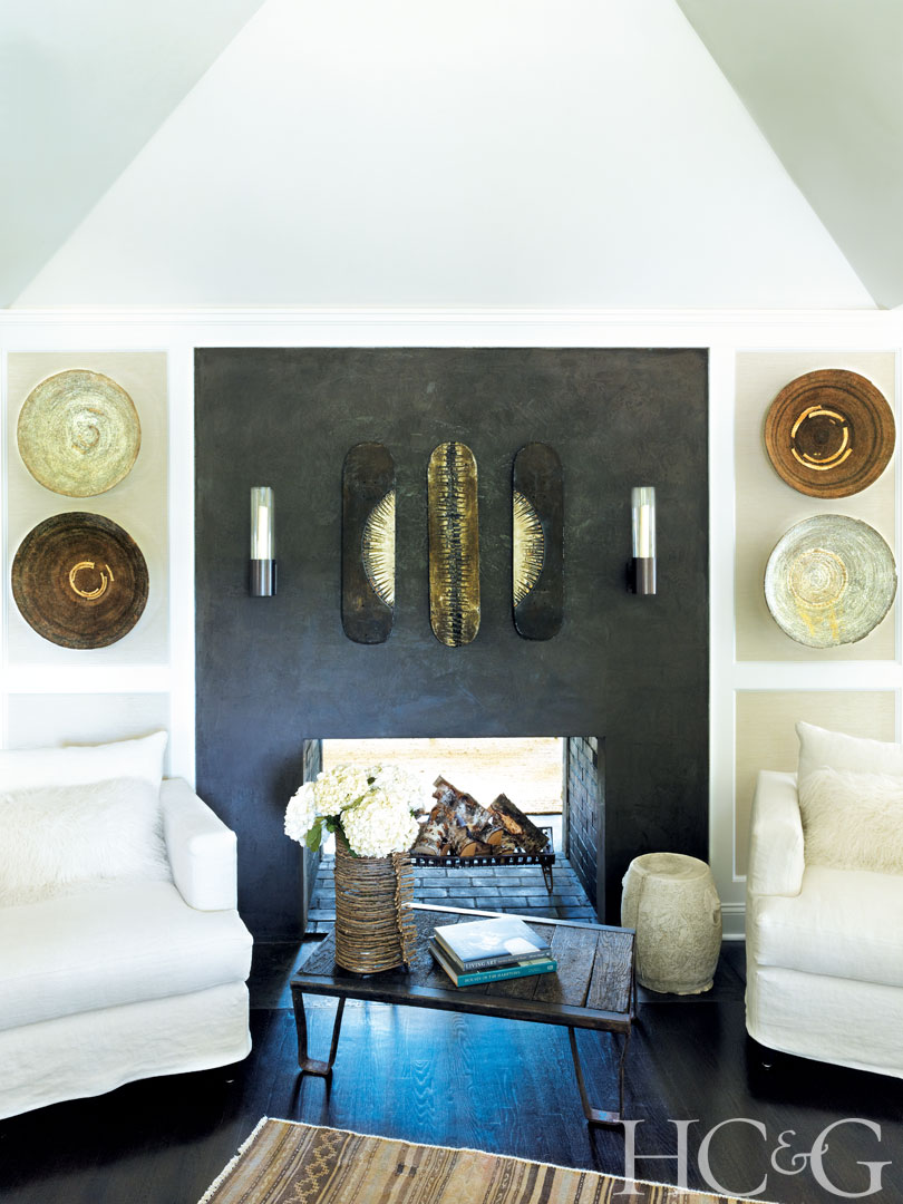Installed above the kitchen fireplace, a pair of sconces by Greg Yale lends modern contrast to a trio of African skateboards.