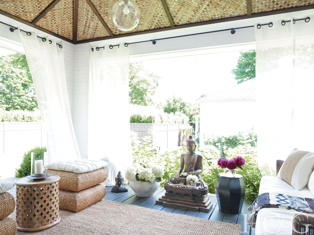 Makeup guru Sue Devitt painted her 1940s redbrick house bright white inside and out to make it seem airier and larger. The indoor/outdoor meditation room’s ceiling is lined with imported African thatch.
