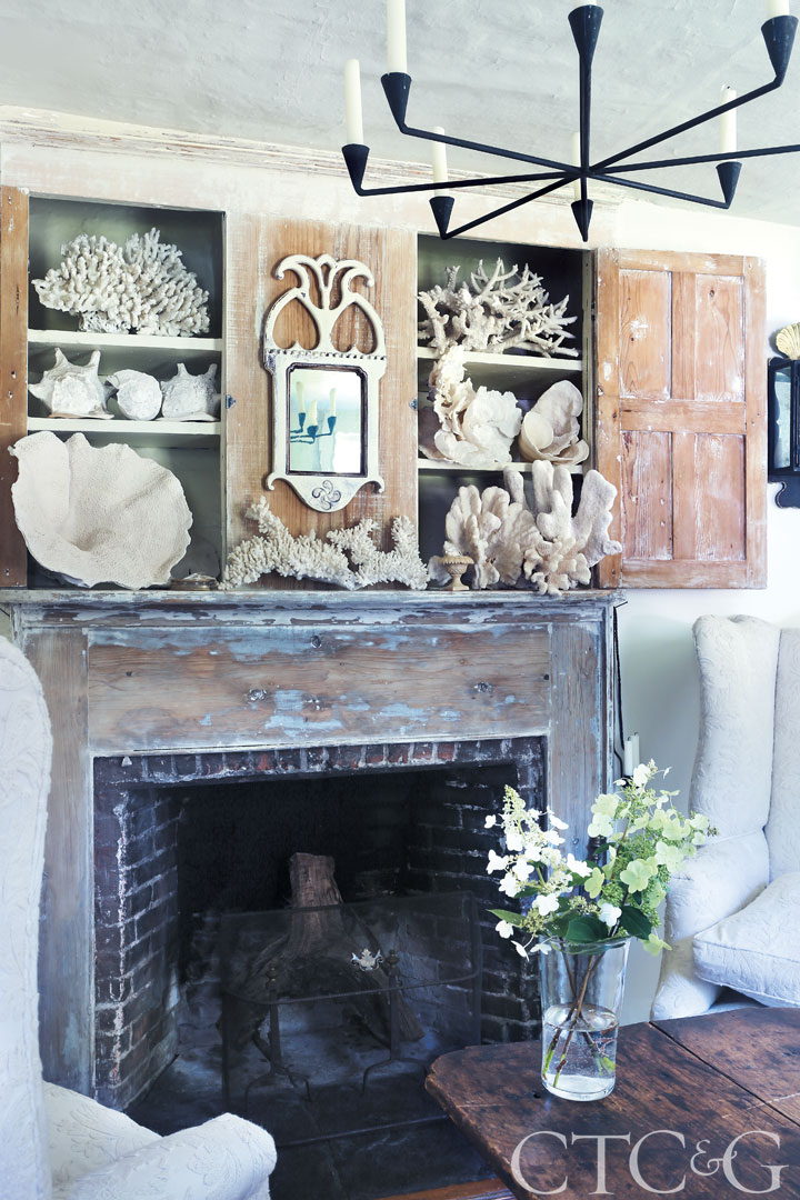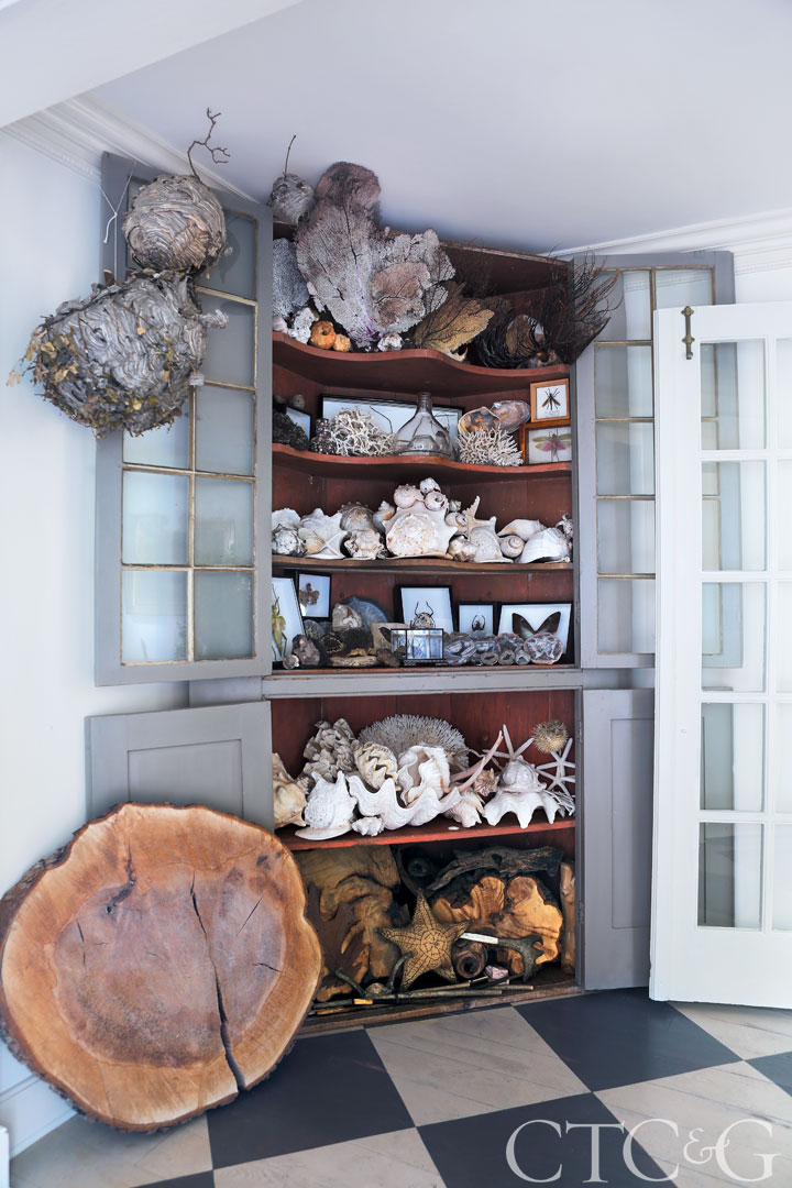 Refreshed with a coat of paint, the corner shelf unit has emerged as a place for all kinds of collectibles, including shells, hives, corals and pieces of wood.