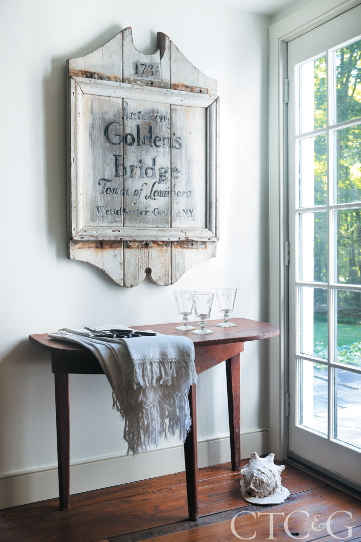 A Golden’s Bridge sign from the Elephant’s Trunk flea market hangs above a painted demilune used as a serving table in the dining room.