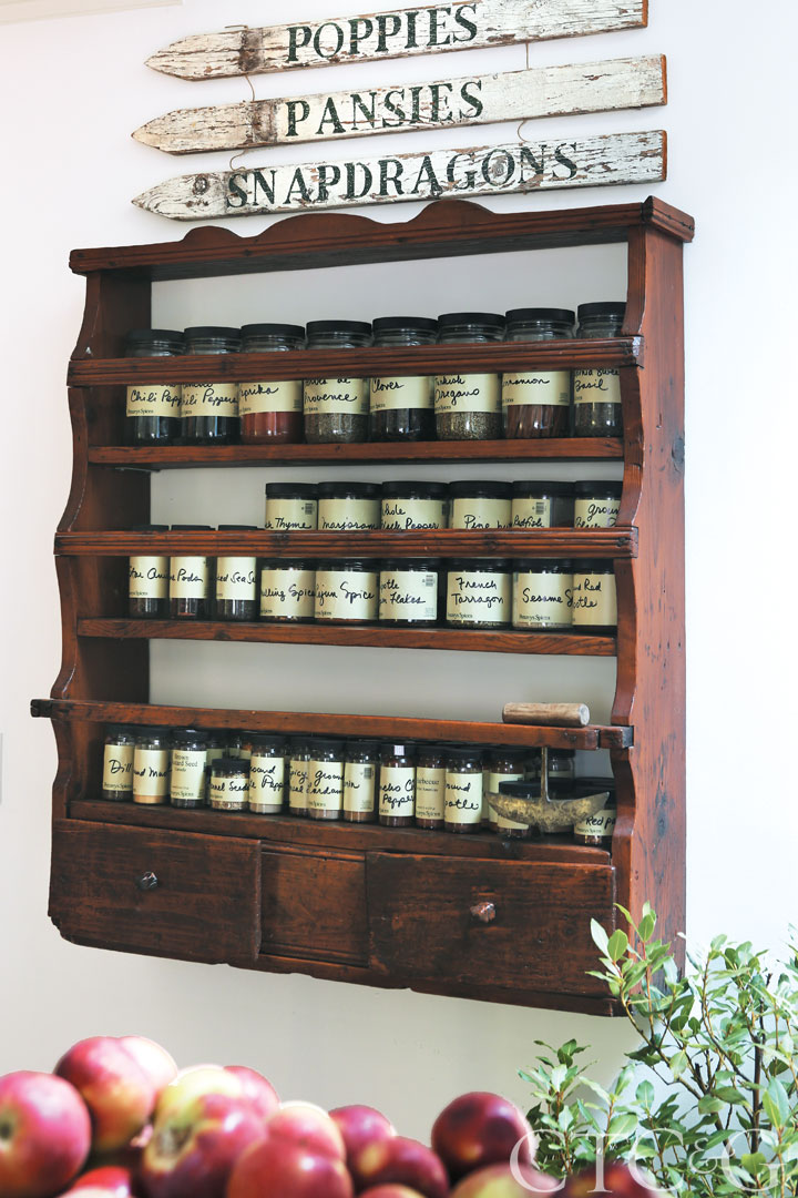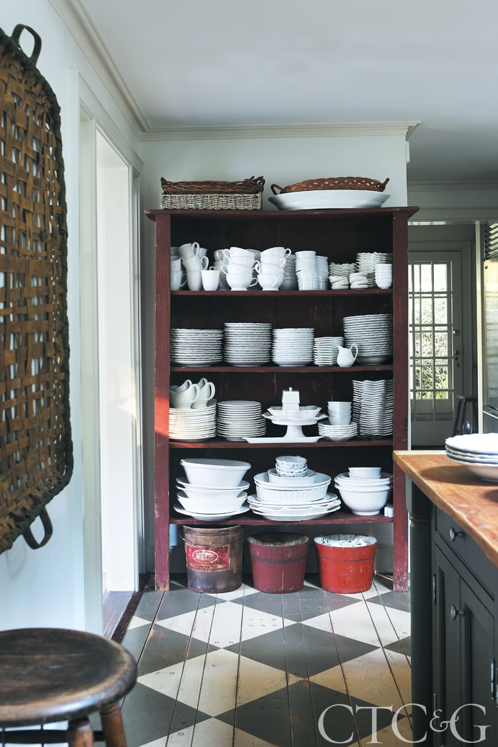 An antique red painted shelf found at the Brimfield antiques market in Massachusetts overflows with white dinnerware from HomeGoods and TJ Maxx.