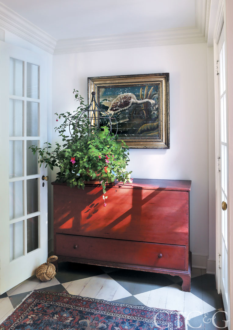 In the main entrance, an 18th-century blanket chest stained red is used to stow mittens, hats and scarves.