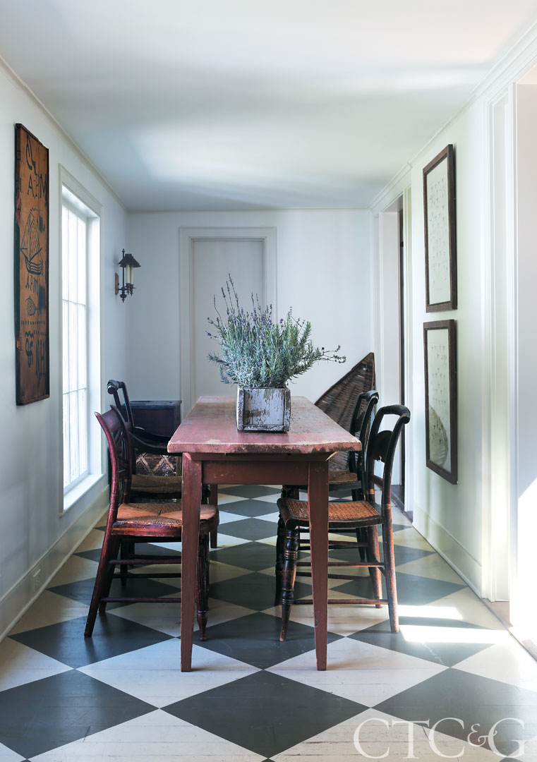 Murphy found a late 19th-century French farmhouse table on 1stdibs. The reproduction Philadelphia armchairs and hoop-back Windsor side chairs are from the Seraph. The mirrored sconces that flank the original fireplace are from Ethan Allen.