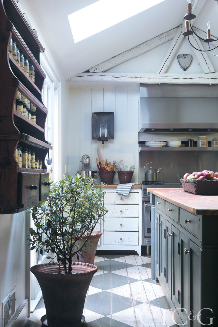 One of the home’s major draws was a gourmet kitchen featuring a cathedral ceiling, early beams and handmade antique wood cabinetry. Murphy added the custom 18th-century reproduction chandelier from Scofield Lighting to the existing over-scaled island and industrial stove. Next to the stove, the electrified gunmetal sconce derived from 19th-century French railroad station lanterns is from Authentic Designs in West Rupert, Vermont.