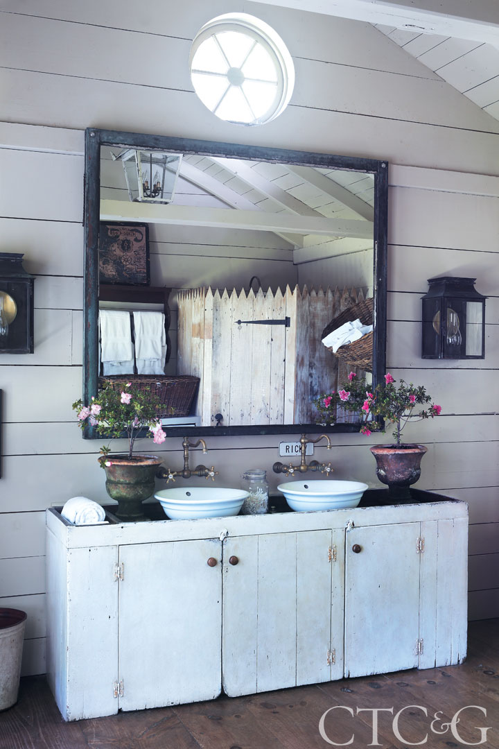 An antique copper casement salvaged from the Flatiron Building in New York City forms the frame for an overscaled mirror in the master bathroom. Reflected in the mirror are the original picket fence walls reimagined as a shower surround. The vanity is an antique dry sink converted to hold sinks reminiscent of vintage mixing bowls. The custom lantern is from Scofield Lighting .