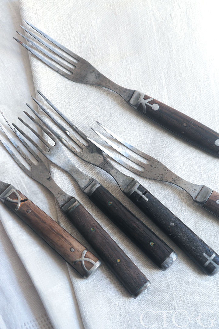 The mid 19th-century wooden-handled forks are also from the Elephant’s Trunk flea market.