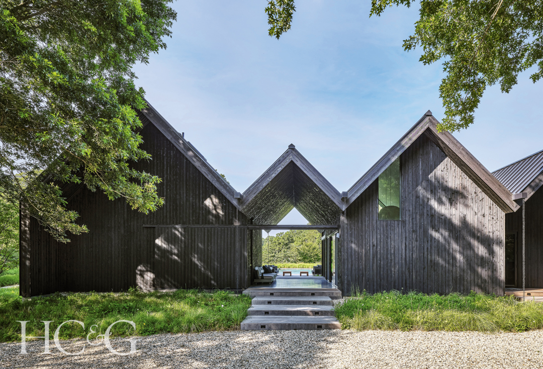 Their house of five gables that appear to pierce and vault across the sky on their meadowed property, a short walk from the village of East Hampton, is one of the more dramatic architectural statements found on the East End. Workshop/APD’s Tyler Marshall designed a deliberately dark house, composed of dramatic peaks, with whole facades of shou sugi ban, an ancient Japanese technique that involves charring wood, in this case Western red cedar. “The shou sugi ban is not only durable and beautiful,” says the architect, “but we also find that the dark color, when set against the tree line, makes the house recede more into nature. It’s also a very intriguing building material because it really allows the grain to shine through and for the texture to actually rise.” As Fogarty emphasizes, “The black of the house blends into the surroundings very well, while a white house would have been too much of a contrast. To me, something about the black color is soothing.”