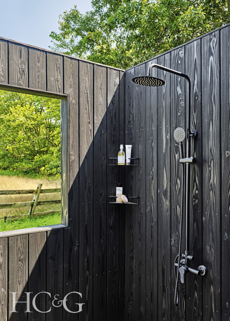 Fogarty and McMullan were involved in every design choice, outside and in. They even found a supplier in Oregon for the shou sugi ban. “We chose a shade in what I would call a ‘middle-burn’ color,” says McMullan. “We decided on a grade of the wood with a subtle charring.” In keeping with its decidedly unconventional shape and presence on the land, Marshall introduced equally novel practical solutions. Rain chains, for instance, as opposed to traditional gutters, are used to channel downpours. “It would have been a sad design choice to have had typical gutter downspouts from the roof,” he says. “The chains let the water drain freely into the ground and collect in gravel-lined wells.”