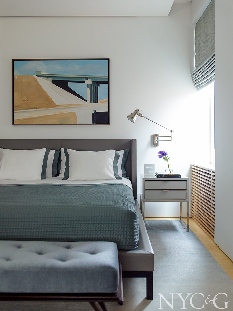 For the master suite, Robinson constructed an utterly relaxing, serene cocoon. In front of the window, a pair of chairs forms a cozy spot to read near the firebox, which is amplified by a cantilevered ledge below and artist Jennifer Bartlett’s four-panel work Shadow above. The bed frame is from Liaigre, but Robinson had the back made higher for more comfortable nighttime reading.