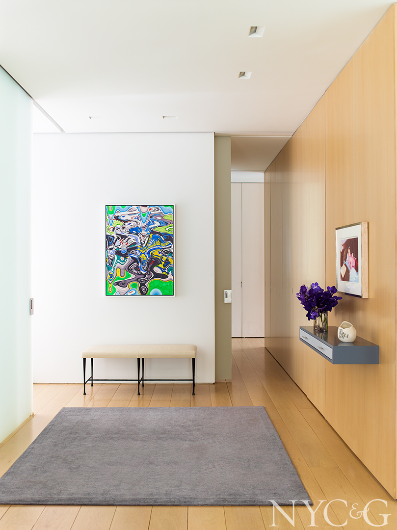 The couple enjoys entertaining—primarily small dinners and cocktail parties—so the living room’s seating plan comprises two sitting areas: far enough apart for separate conversations, but close enough for group engagement between them. Virtually every space in the apartment, in fact, exudes an open, uncluttered feel. In the foyer, for instance, Robinson installed a cantilevered drawer-cum-catchall that offers a focal point against a long, monolithic wall without appearing too bulky, as a heavy desk or console would. Said wall is also separated into panels that conceal storage areas, further keeping everything neat and tidy.