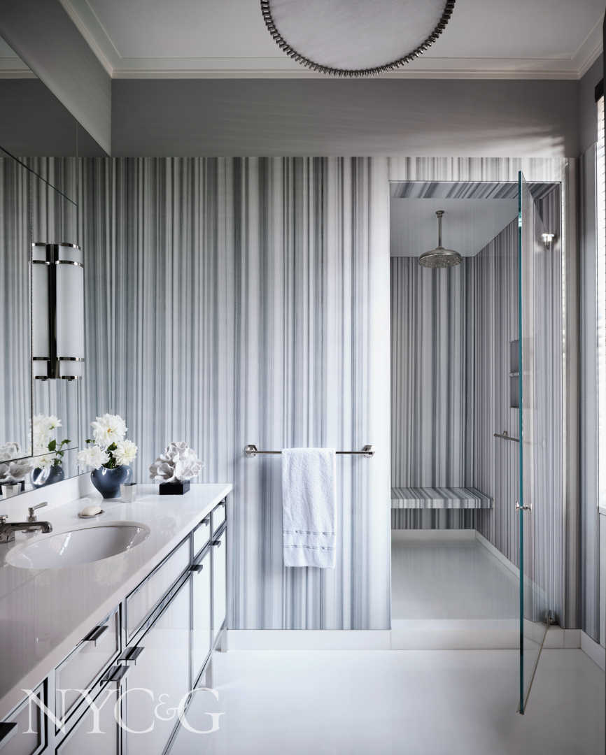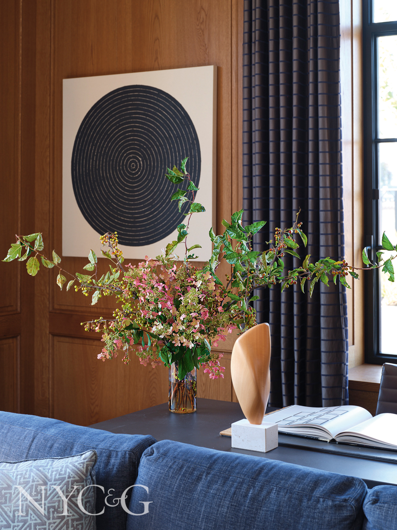 But the magic lies not just in the volume and views. Every detail and material was carefully and collaboratively considered—from the trim embroidery on the drapes to the mother-of-pearl wallpaper in the dressing room. The clients wanted the apartment to feel like a refuge from the city, which Hagan delivered with her signature polished, yet comfortable, style. For the décor, Hagan says that she was inspired by light and spectacular views. “This is an apartment for all seasons,” she says. “With views of the park and down Park Avenue, you see the change of seasons in Manhattan, and there are different parts of this apartment that really compliment those different seasons.” The cozy wood-paneled library that acts as the connection between the two wings, for example, is ideal for winter with its wood burning fireplace (a grandfathered-in feature that Samora cleverly borrowed from the adjoining room by flipping the firebox’s orientation). While the family room, wallpapered in grasscloth and accented with a lively leaf green color, calls to mind spring.