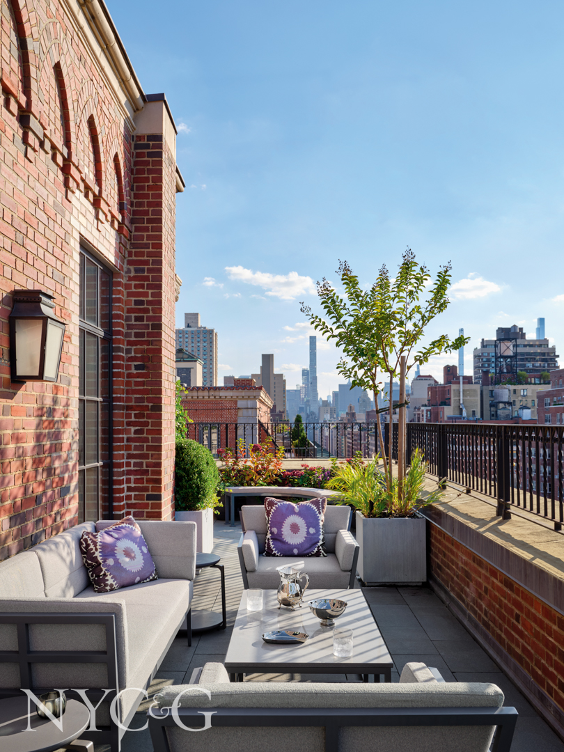 The indoor-outdoor connection is enhanced by the many steel-framed windows and French doors, which materially feel like they could have always been there, but are, in fact, entirely rearranged and greatly enlarged. Samora and Hagan describe them as a bridge from the building’s gothic exterior and the inside, but Hagan adds they also “make a really strong contemporary move on the interior.” With the great room’s French doors flung open to the terrace, the homeowners really have the best New York. As Hagan says,“The ability to have this grand, special loft-like space in New York City? I think that’s the dream.”