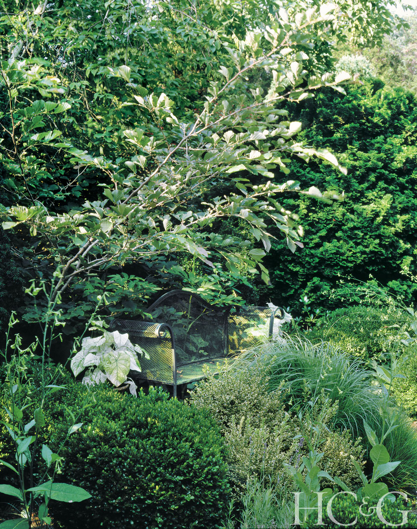 White-leafed caladiums illuminate an iron bench in a shady nook off the herb garden, which is on an axis with the living room’s bay window.