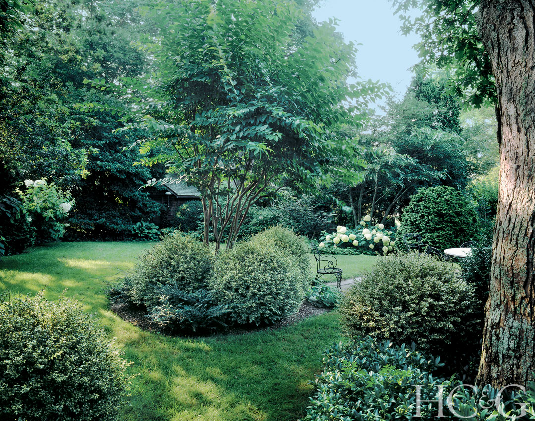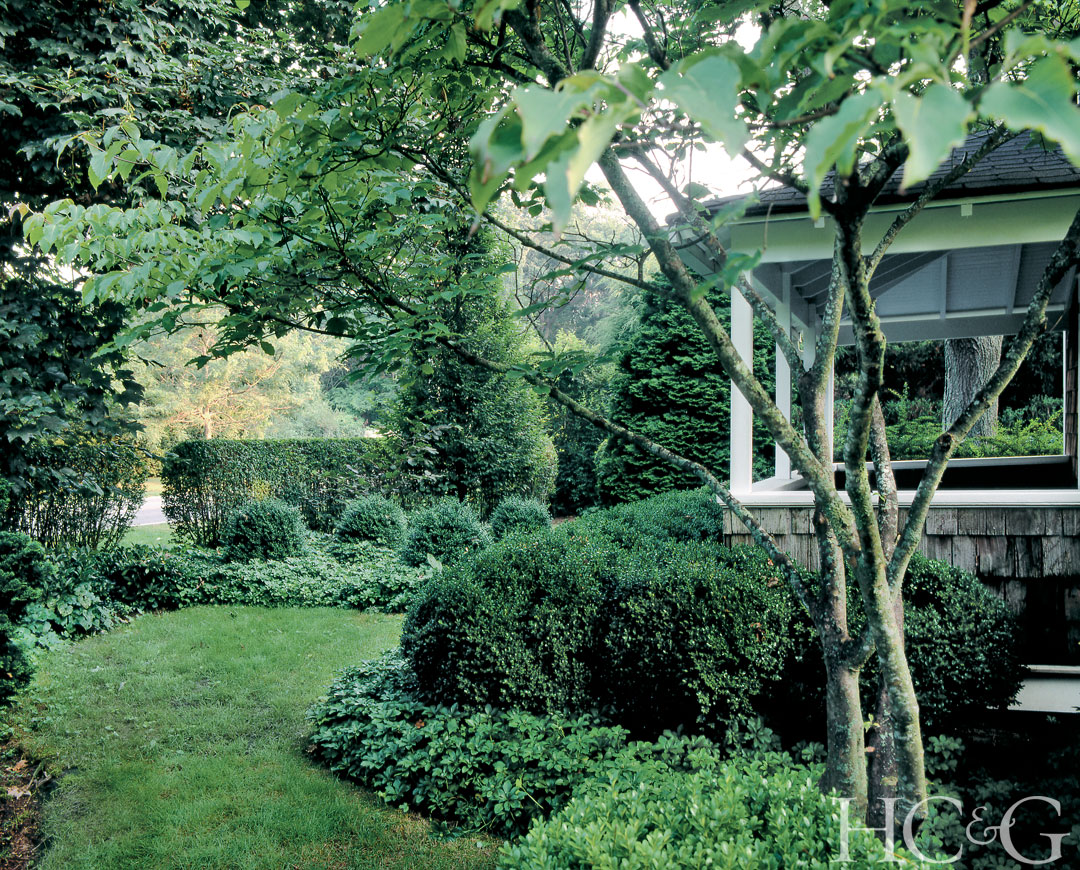 To brighten up a shady spot adjacent to the back dining terrace, Tyree used a variegated boxwood.