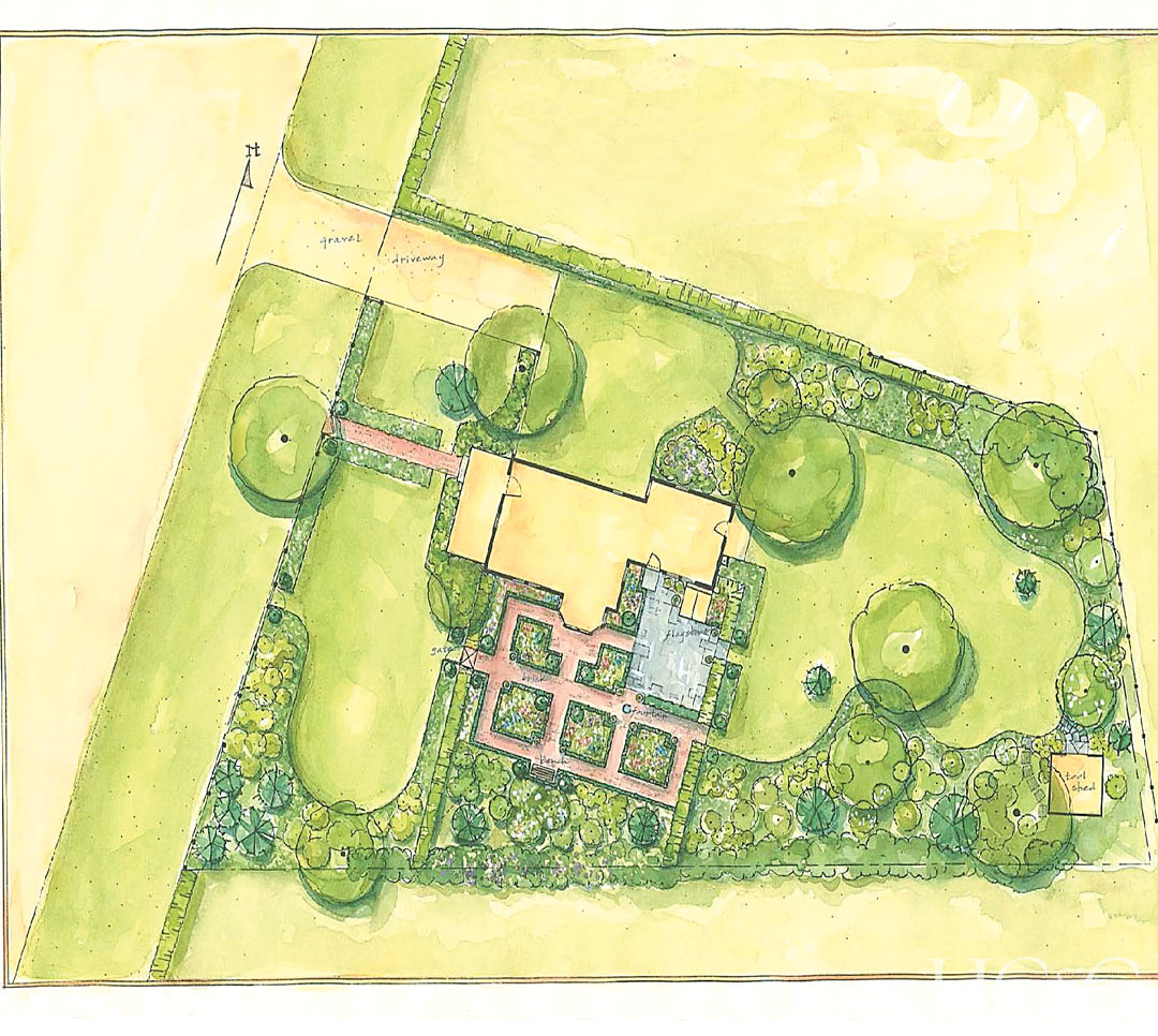A formal brick parterre and gently curving paths of the lawn.
