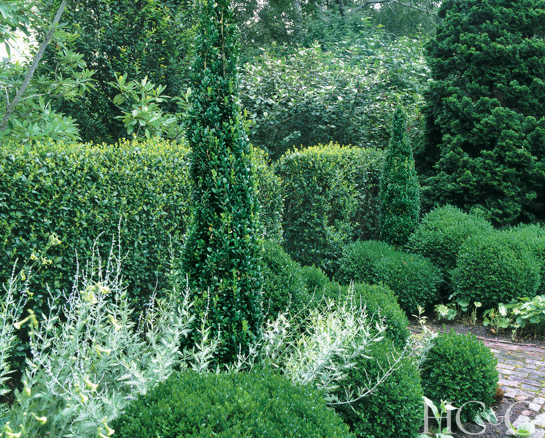 Homeowner Allen Logerquest “brought his own ideas to the garden,” explains Landscape designer Joseph Tyree, “like using the Buxus sempervirens ’Graham Brady’, which creates great vertical interest among the box balls in the herb garden.”