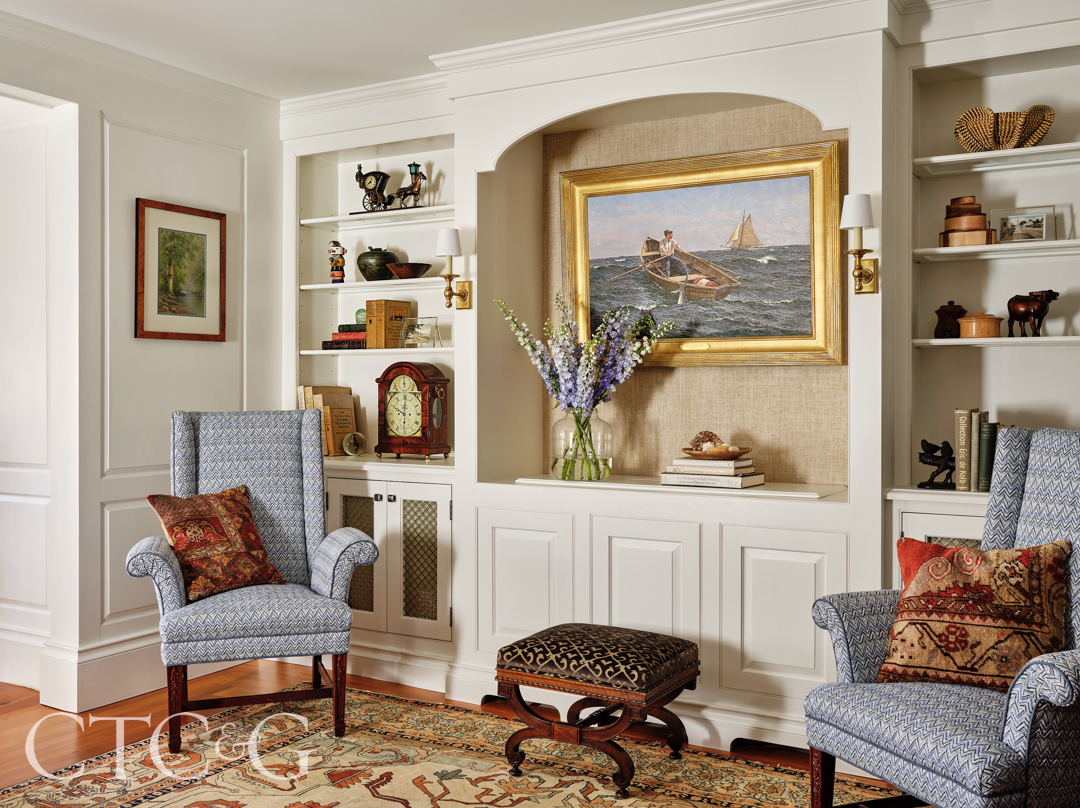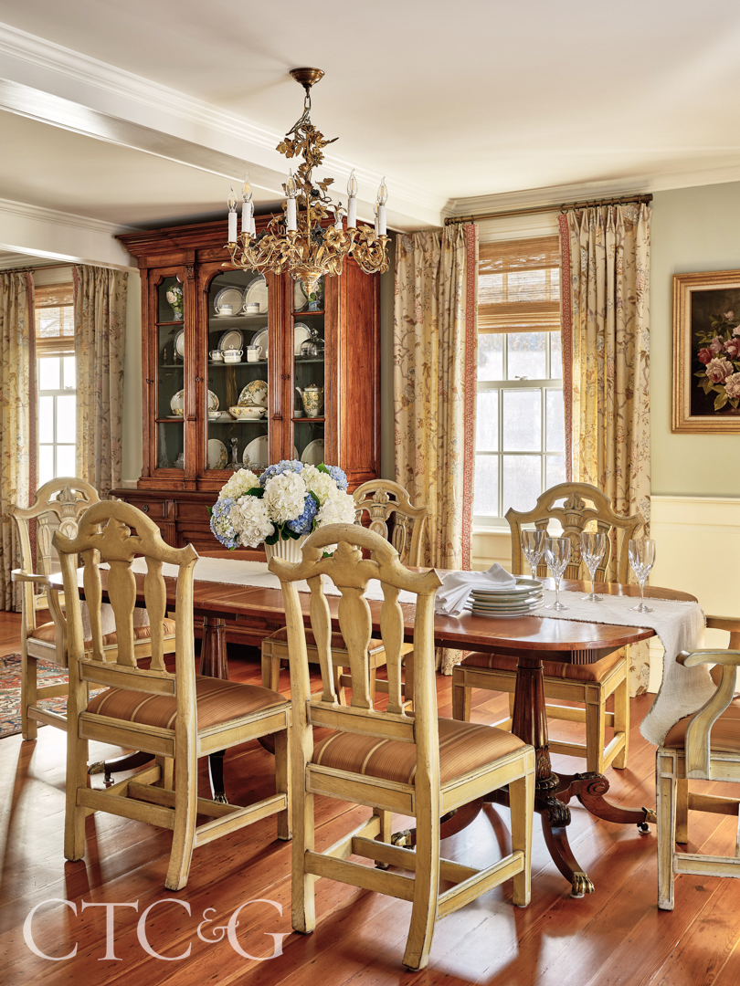 This is where interior designer Leslie Driscoll’s skills for designing custom cabinetry and historic mouldings came into play. Calculating at times within fractions of an inch, she accommodated the couple’s extensive eclectic antiques collection, including an exceedingly tall floor clock. Wide mouldings and a fresh color palette infuse the interiors with warmth and tie open living areas together.
