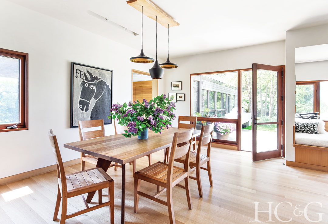 Crate & Barrel chairs surround a Jean Prouvé table in the dining area; the painting is by Freddie Brice.