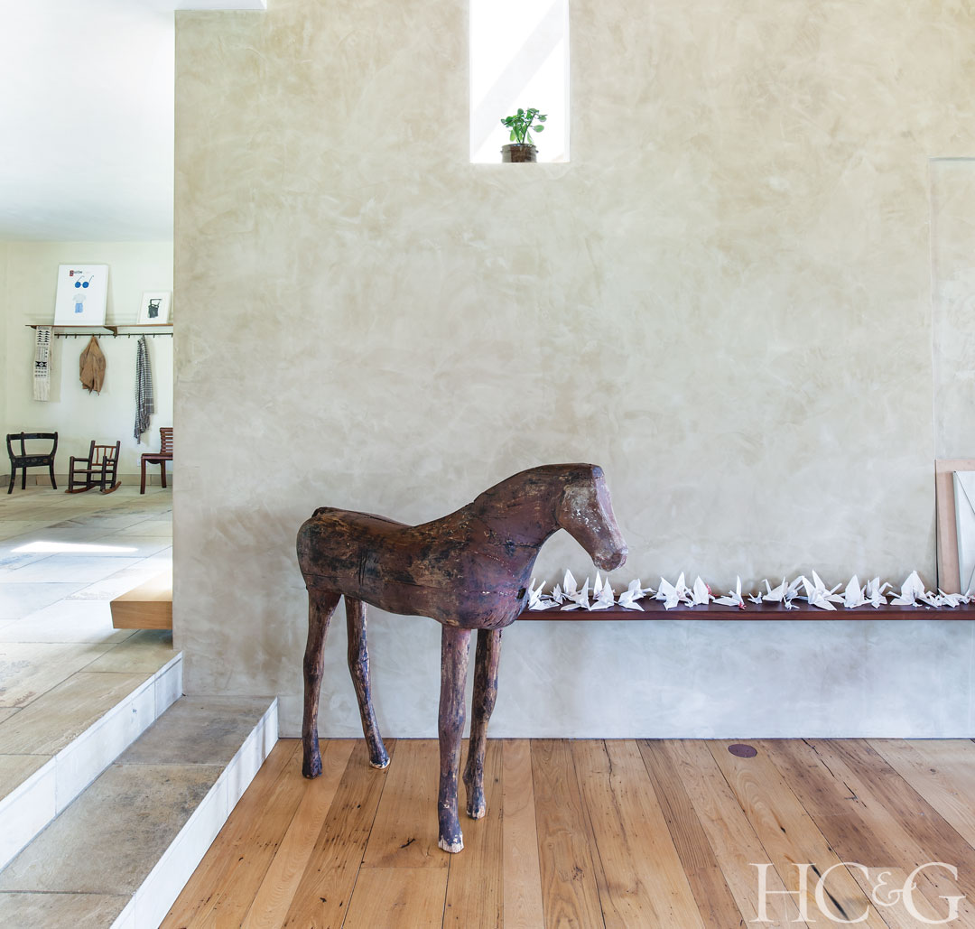 In Ross’s living room, a late-19th-century wooden horse stands sentry next to a shelf lined with paper cranes made by Ross’s niece.