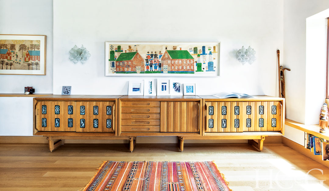 Running nearly the length of the master bedroom, a 1940 Maurice Pre oak credenza with built-in tiles sits below a 19th-century folk art painting; the glass sconces date from the 1950s.