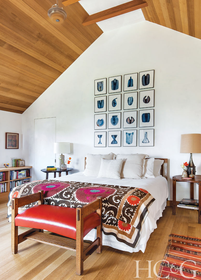 Works by Hamptons-based artist Bastienne Schmidt hang above Ross’s bed; the Gustav Stickley bench is circa 1901.