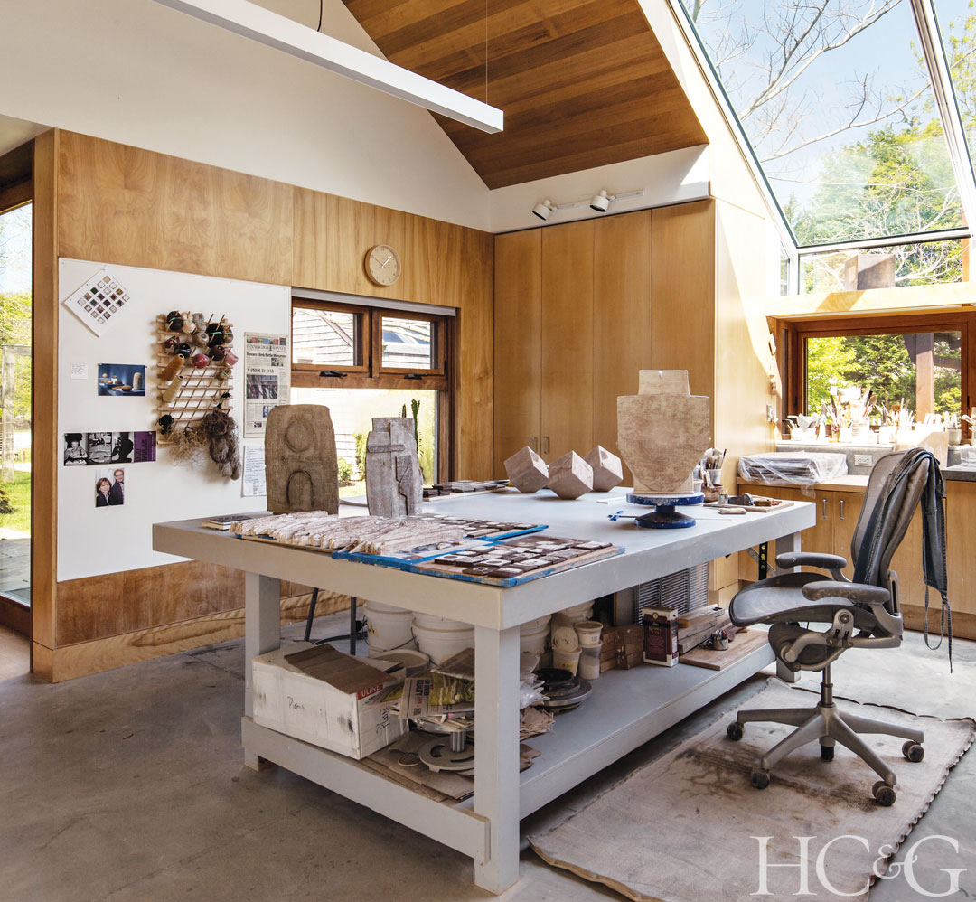 Ross’s studio includes separate work and seating areas. The butterfly chair is from Comerford Collection.