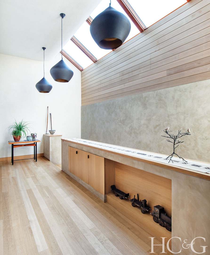 A built-in shelf on the upstairs landing holds a collection of 19th-century toy train cars.