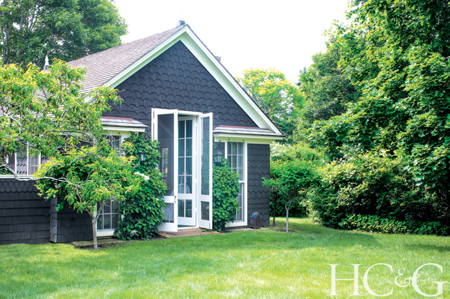 Climbing hydrangeas flank the entrance to decorator Richard Keith Langham’s garage-turned–guest cottage in Water Mill, which features walls painted in Benjamin Moore hues. Richard Keith Langham’s