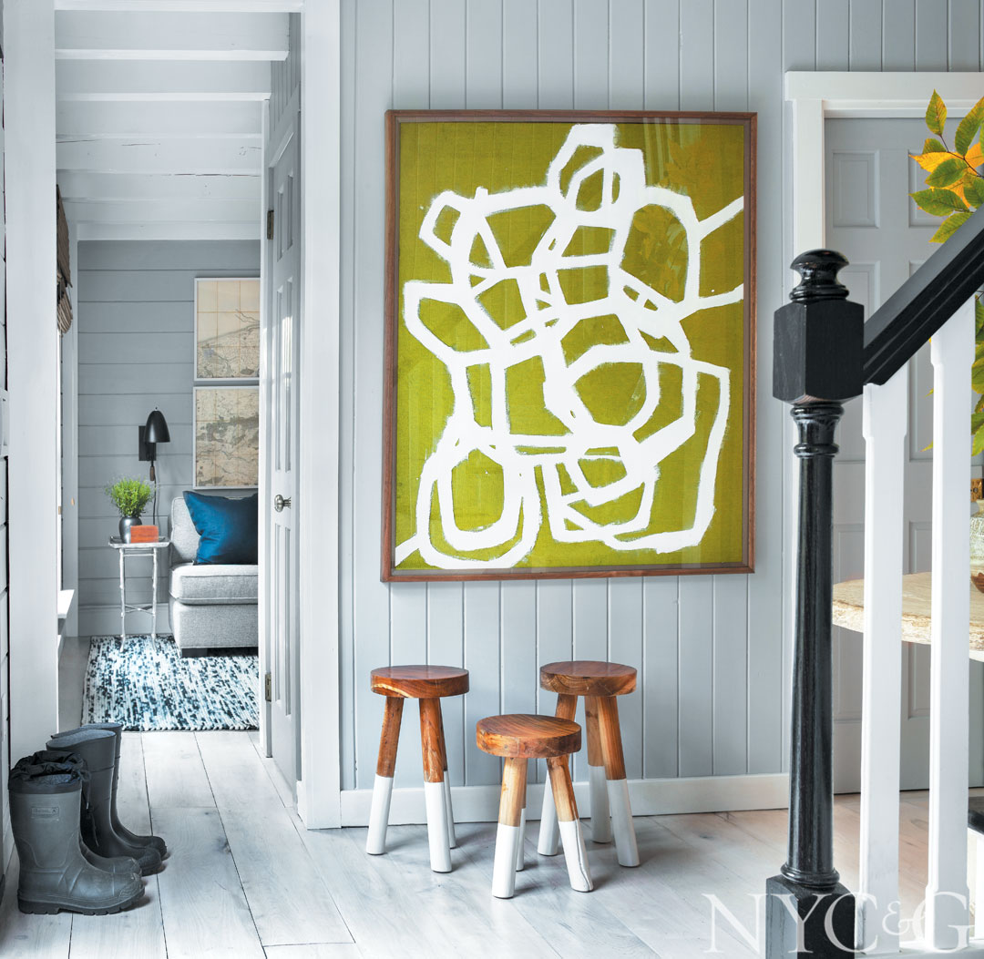 In the entry, a paint-on-velvet work by Julian Chichester hangs above dip-dyed stools from Serena & Lily.