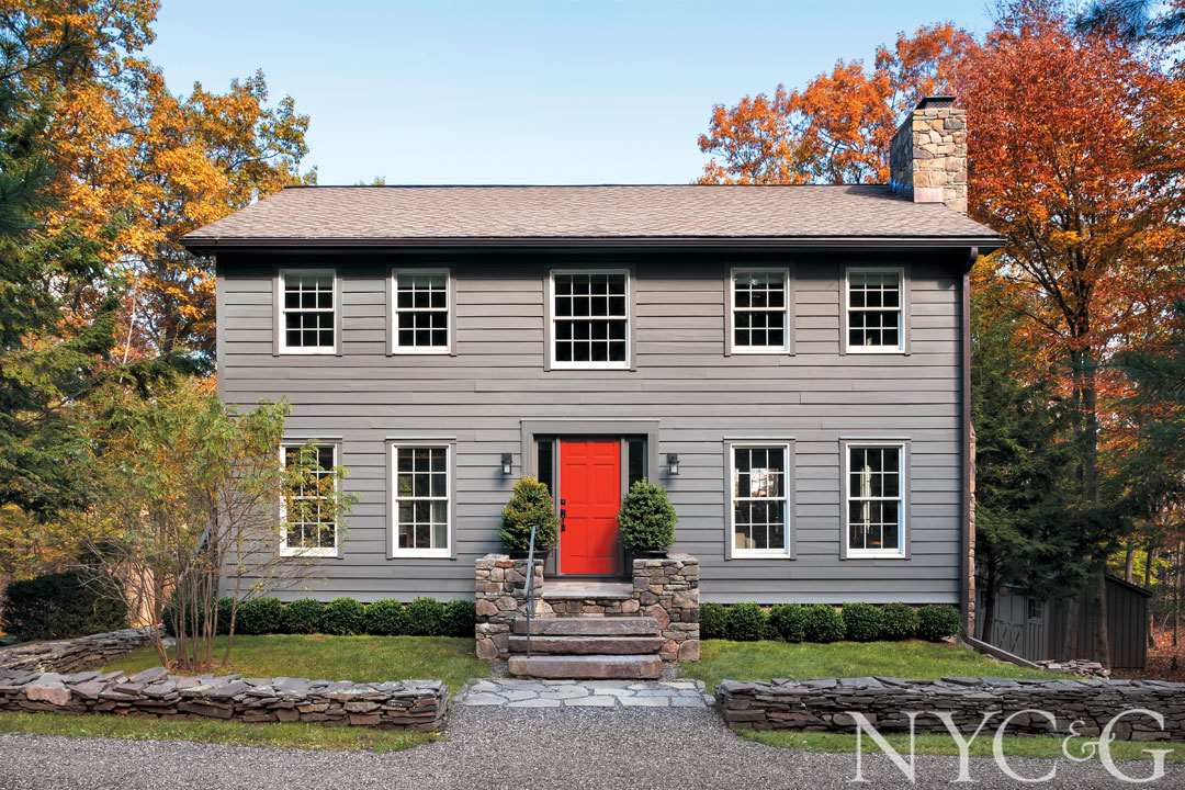 The façade of John Willey’s weekend home in Millerton, New York, is clad in charcoal gray–stained clapboard and punctuated by a front door painted Benjamin Moore’s Heritage Red.