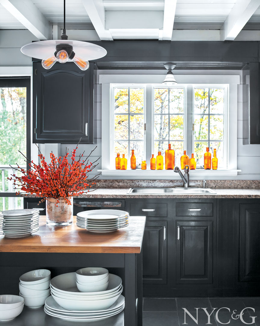 Vintage amber glass bottles line the windowsill in the kitchen, which features granite countertops and cabinets painted Benjamin Moore’s Black.