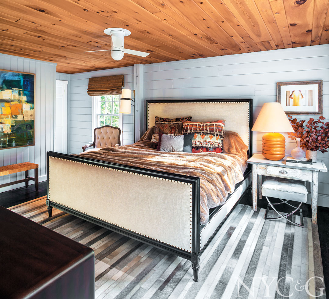 Restoration Hardware’s Maison Panel bed in Antiqued Black sits on a pony-skin rug from Beauvais Carpets in the master bedroom.