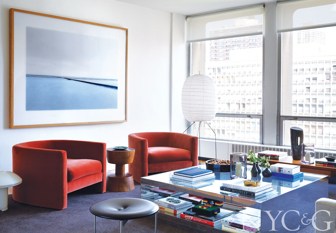 In the living room, a pair of Milo Baughman rose-hued velvet armchairs found at a flea market sit beneath a photo by Elger Esser. The lantern is a Noguchi design.