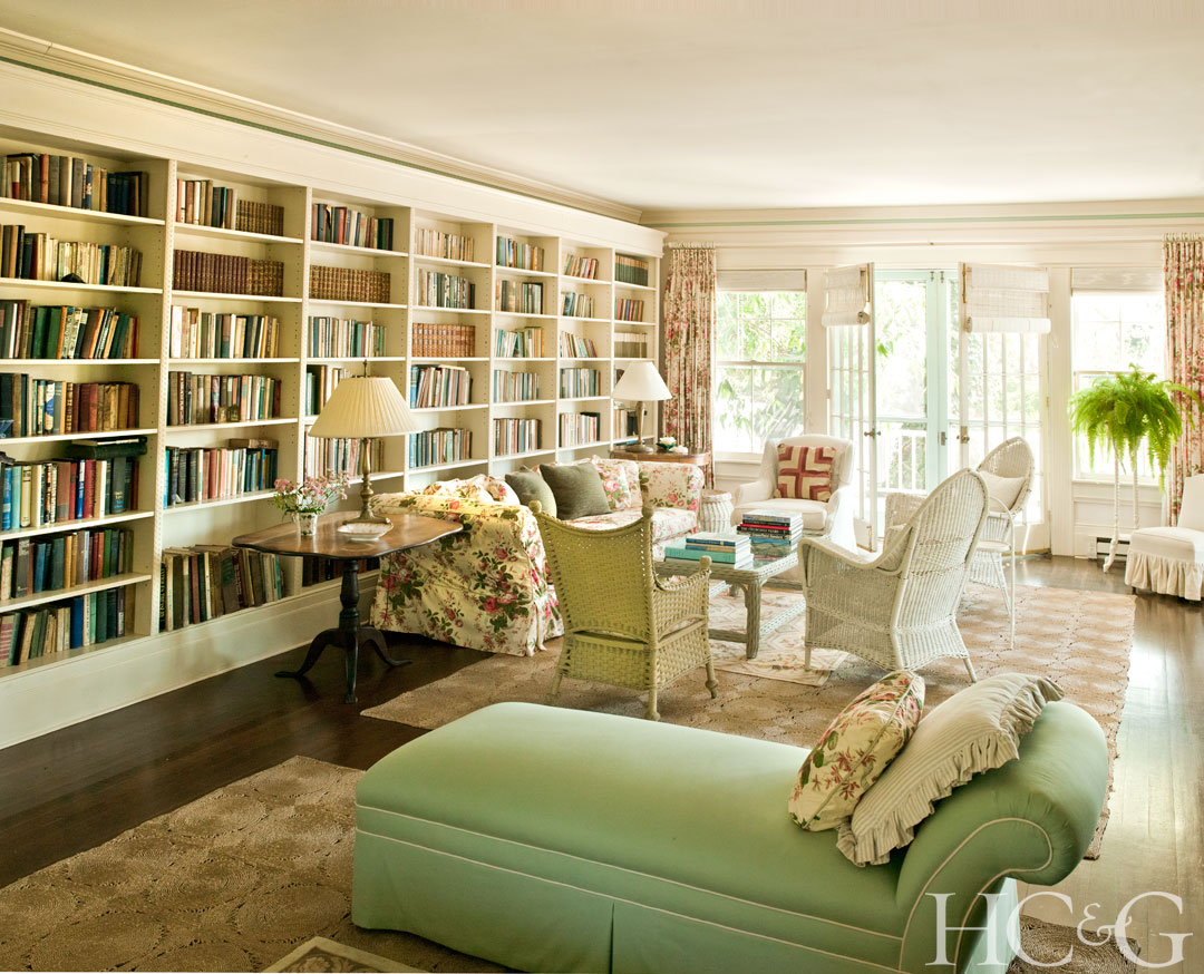 Voracious readers, Quinn and Bradlee spend many hours in both the book-lined living room. Many of the books and most of the wicker furniture were left in the house by Little Edie.