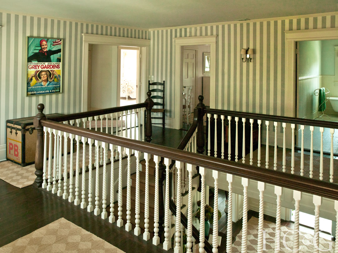 The second-floor landing features a Cowtan & Tout striped wallpaper and a poster from the 2009 HBO movie Grey Gardens, which hangs above a trunk once owned by Phelan Beale Jr., Little Edie’s brother.