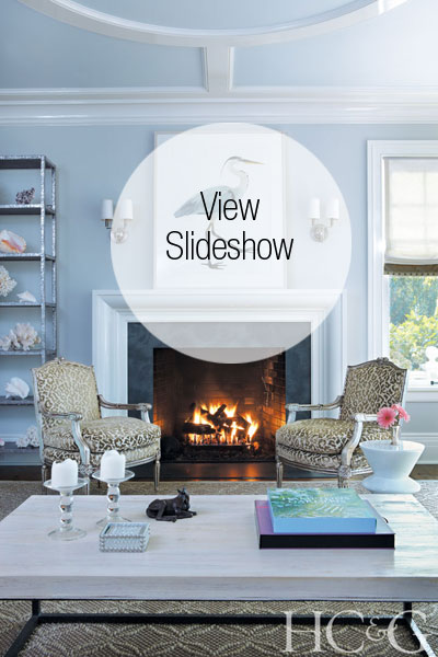 One can’t help but gaze upward in the living and dining areas, where shallow yet substantial coffers form dramatic, centralized circles—also glistening with a high-gloss sheen. “Paneling and beadboard would have been too traditional, and hefty molding would have truncated the room’s height,” McCoy notes. A mirrored wall in the dining area reflects light into the north-facing room; one sliding section of the wall reveals a pocket-door conduit to the kitchen, which features a custom-designed reclaimed oak island topped with two-inch-thick honed Carrara marble (“I wanted it to look aged,” says McCoy). On the south side of the kitchen, she carved out an adjoining sitting area, from which “it’s impossible to get guests to vacate when I’m entertaining.” The enclosed back porch, which flanks the kitchen, dining, and living rooms, has exponentially increased her year-round livable space. “I can seat 18 without moving anything,” adds McCoy, who enjoys views of the family pond from both the porch and every rear window on the second floor.