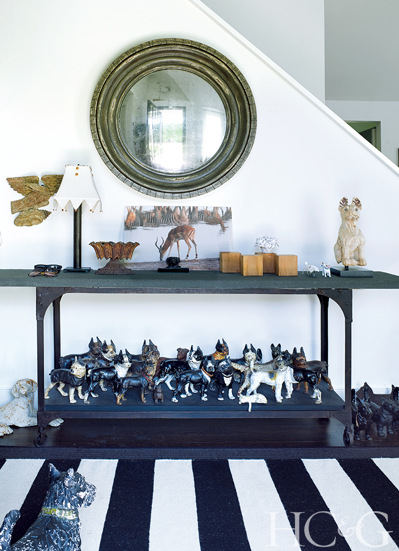 In the entryway to Peri Wolfman and Charles Gold’s house in Southampton, a collection of cast-iron bulldogs holds court on a sideboard from English Country Antiques.