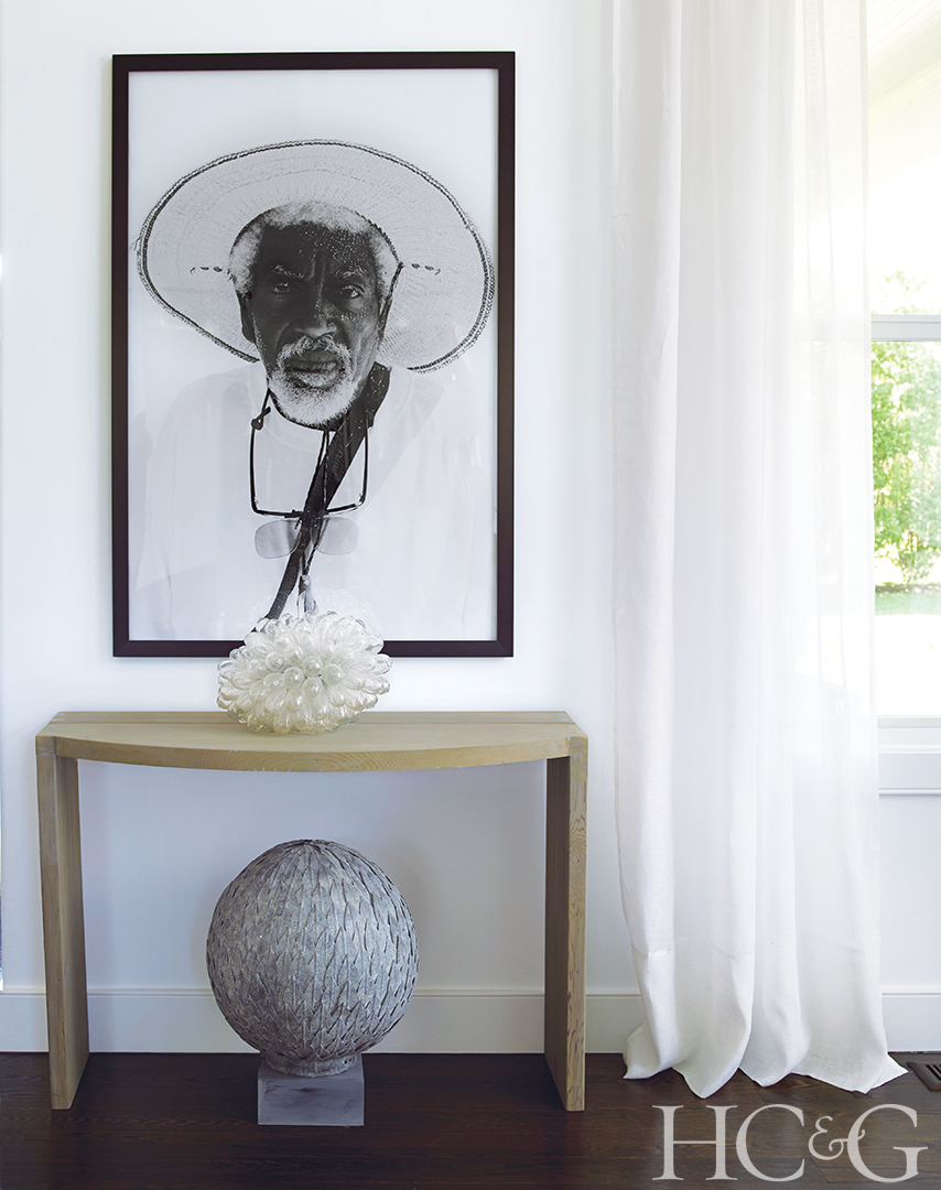 In a corner of the living room, a Lynn Blodgett photograph hangs above a Charles Gold–designed demilune table and a Calypso St. Barth lamp made of hand-blown glass orbs.