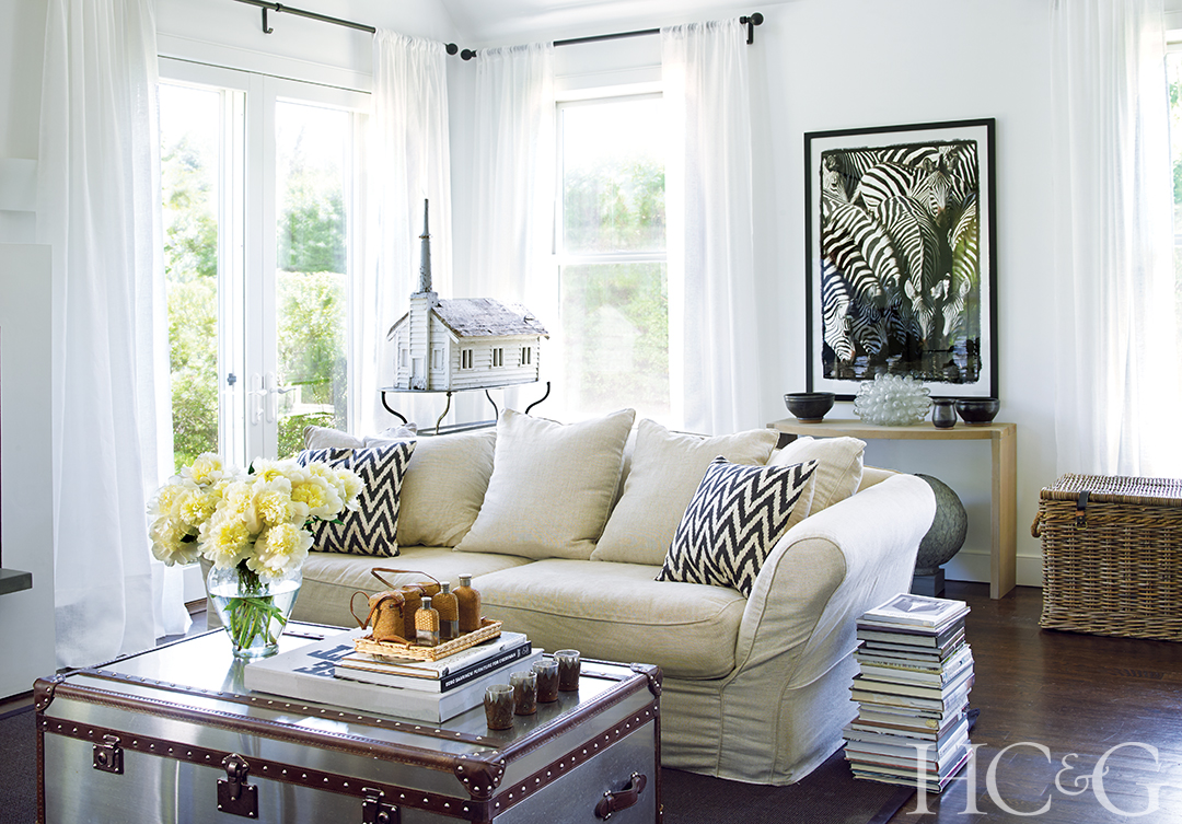 The living room features an RH sofa and trunk, in addition to a house-lot ornament from the early 1900s.